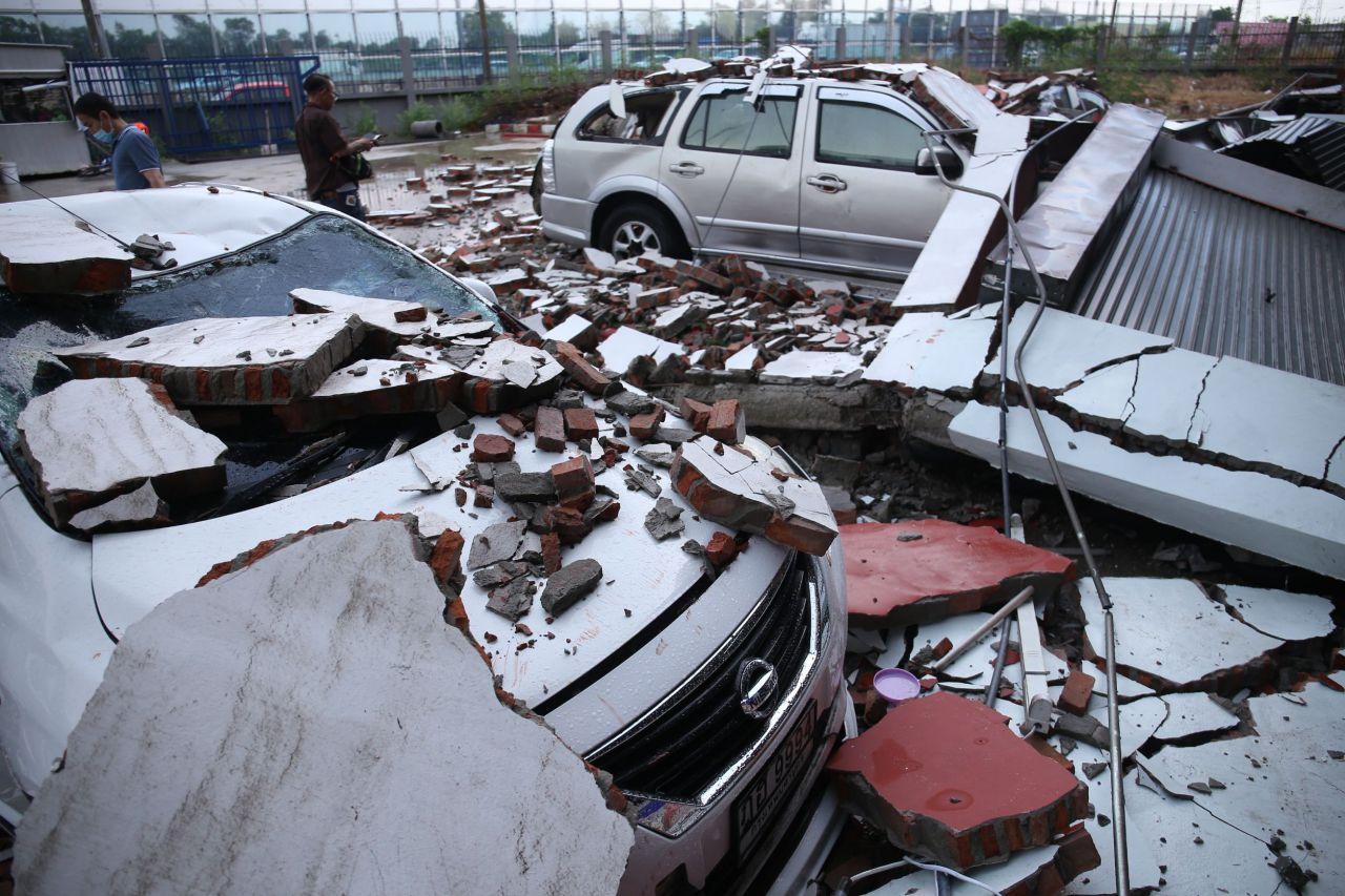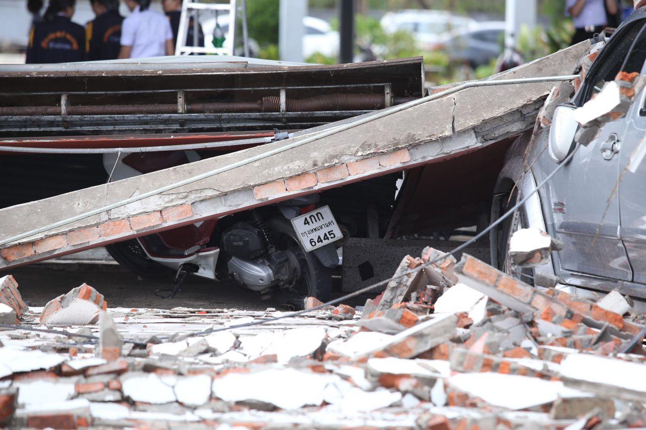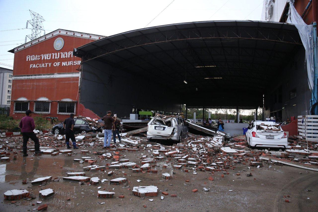 พายุถล่มลำลูกกา ผนังคอนกรีตของโรงอาหารมหาวิทยาลัยเวสเทิร์น ถูกลมพัดพังถล่มทับรถยนต์ และจยย.ของเจ้าหน้าที่มหาวิทยาลัยเสียหายรวม 6 คัน โชคดีไม่มีผู้บาดเจ็บ...