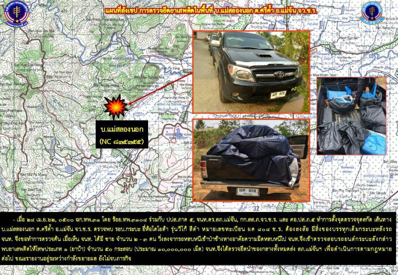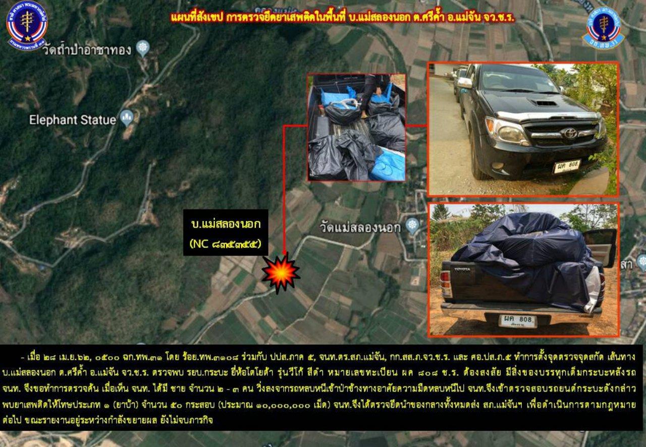 เมื่อเวลา 10.00 น. วันที่ 29 เม.ย. 62 พล.ต.ต.ยุทธชัย พัวประเสริฐ ผบก.เชียงราย ได้รับรายงานจาก พ.ต.อ.พงษ์สวัสดิ์ ไชยบาล ผกก.สภ.แม่จัน ว่าเมื่อเวลา 15.00 น. วันที่ 28 เม.ย. 62 สืบทราบว่าจะมีการลำเลียงยาเสพติดจำนวนมากจากชายแดน อ.แม่ฟ้าหลวง ผ่านเข้าพื้นที่ จึงสั่งการชุดสืบสวน สภ.แม่จัน ร่วมกับ ทพ.3108 ป.ป.ส.ภาค 5 ชุดสืบสวน บก.ภจ.เชียงราย ออกหาข่าวตรวจสกัดแก๊งรับจ้างขนยาบ้า จนกระทั่งไปถึงถนนสายรอง บ.แม่สลองนอก ต.ศรีค้ำ อ.แม่จัน พบรถกระบะโตโยต้า วีโก้ สีดำ ทะเบียน ผค 808 เชียงราย บรรทุกสิ่งของเต็มหลังรถมีผ้าใบสีดำคลุมท้ายอย่างมิดชิด วิ่งมาจากเส้นทางชายแดน อ.แม่ฟ้าหลวง ผ่านเข้ามา เจ้าหน้าที่จึงให้สัญญาณจอดเพื่อขอทำการตรวจค้น แต่รถคันดังกล่าวได้ขับแหกด่านแล่นไปทางบ้านห้วยส้านเก่า ภูใจใส รีสอร์ท หมู่ 8 ต.ศรีค้ำ อ.แม่จัน จ.เชียงราย