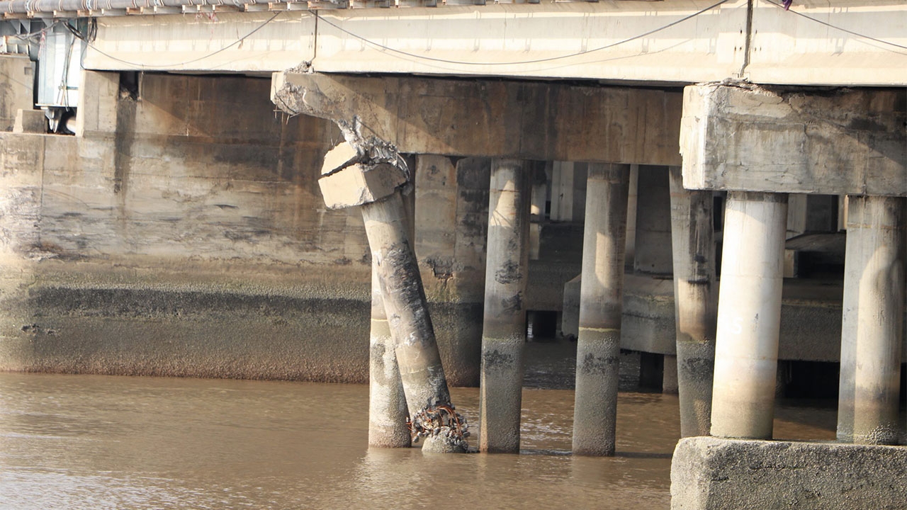 สภาพเสาตอม่อข้ามแม่น้ำบางปะกง ถนนเทพรัตน (บางนา-ตราด) กม.50 ช่องคู่ขนาน ขาเข้า กทม. หมู่ 4 ต.ท่าข้าม อ.บางปะกง จ.ฉะเชิงเทรา ถูกเรือลากจูงสินค้าจากแหลมฉบังไปที่ท่าเรือบ้านโพธิ์ชนจนหักเสียหายแล้วไม่รับผิดชอบและไม่แจ้งหน่วยงานที่เกี่ยวข้องรับทราบ.