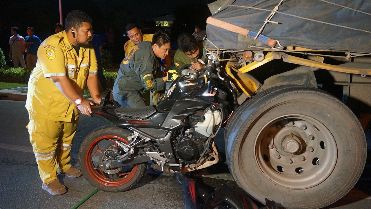 หนุ่มวัย 33 ซิ่งนินจา 300 ซีซี เสียหลักพุ่งชนท้ายพ่วง 18 ล้อ รถเสียบคาท้ายพังยับ ส่วนคนขับดับคาที่ จนท.คาดมาด้วยความเร็ว ไม่ทันสังเกตเห็นรถข้างหน้า จึงขับชนท้ายเป็นเหตุสลด