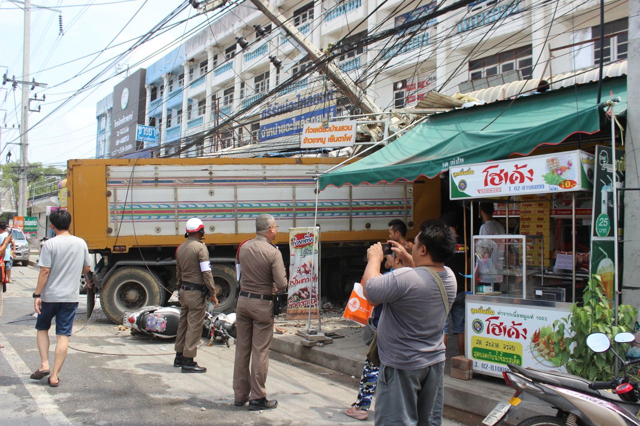 เมื่อเวลา 11.00 น. วันที่ 26 พ.ค.62 ร.ต.อ.นิพล ภูธรฤทธิ์ รอง สว.(สอบสวน).สภ.บางบัวทอง จ.นนทบุรี รับแจ้งเหตุ รถสิบล้อพ่วง หลุดพุ่งชนรถปิ๊กอัพ 2 คัน และเสาไฟฟ้าหัก 1 ต้น ก่อนพุ่งเข้าร้านค้า มีผู้ได้รับบาดเจ็บบนถนน บางกรวย-ไทรน้อย ตรงข้ามตลาดนัด อิคิวซัง ฝั่งขาเข้า อ.บางบัวบัวทอง ม.6 ต.บางบัวทอง อ.บางบัวทอง จ.นนทบุรี จึงเดินทางไปตรวจสอบที่เกิดเหตุ