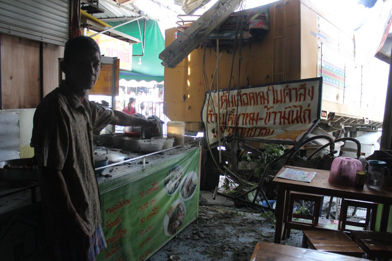 สอบถาม นายธนพงษ์ เอี่ยมขจรชัย อายุ 70 ปี เจ้าของร้านก๋วยเตี๋ยวบ้านสวน กล่าวว่า ขณะเกิดเหตุ มีลูกค้าอยู่ในร้าน 3 โต๊ะ ตนเองอยู่ด้านหลังของร้าน ได้ยินเสียงดังคล้ายรถชนกันจึงออกมา พบว่าลูกค้าวิ่งกรูเข้ามาด้านในและรถได้พุ่งเข้ามาทางหน้าร้านฝุ่นควันคลุ้งไปทั่วบริเวณ และได้ยินเสียงคล้ายประทัดดังขึ้น 2-3 ครั้ง แต่ไม่มีผู้ใดได้รับบาดเจ็บ แต่ข้าวของที่อยู่หน้าร้านได้รับความเสียหาย