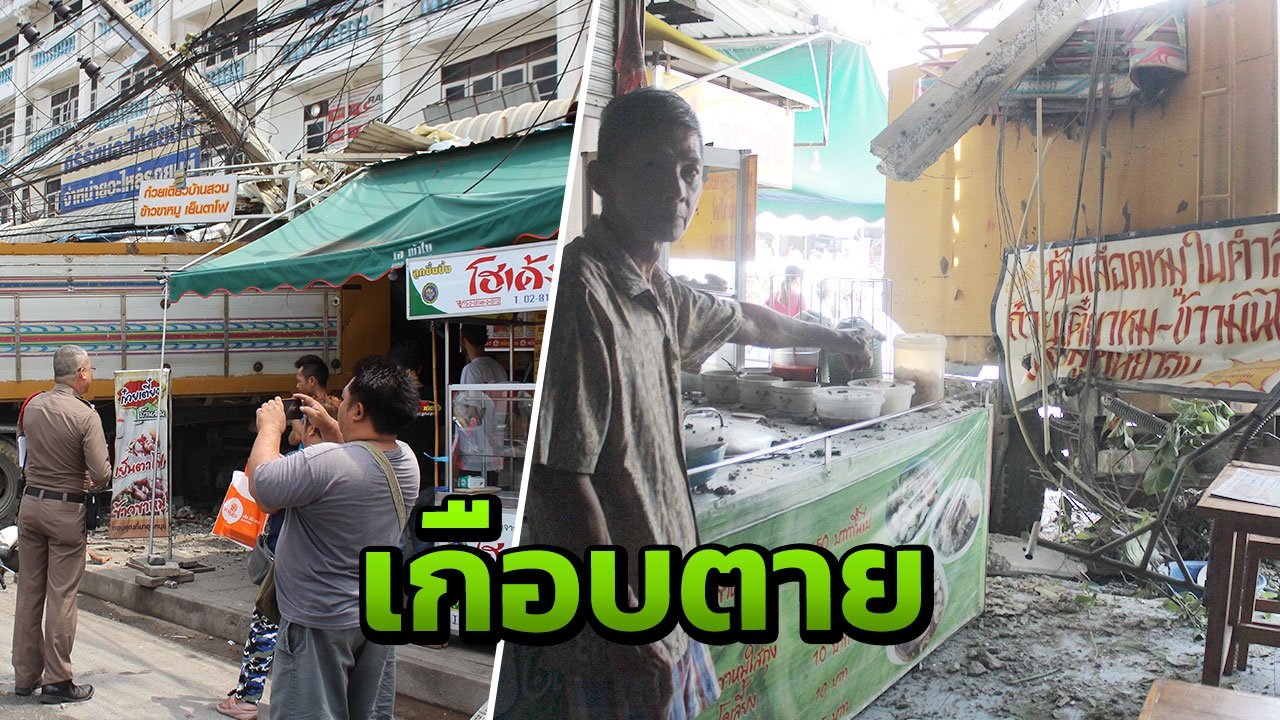 ลูกพ่วง 12 ล้อหลุด พุ่งชนปิกอัพ 2 แม่ลูก สายไฟฟ้าแรงสูงขาดพาดหลังคารถช็อตหลังคาทะลุ หนีตายออกจากรถ ชาวบ้านออกมาช่วยดับไฟ ก่อนชนเสาไฟหักเข้าร้านก๋วยเตี๋ยว ลูกค้าวิ่งหนีตายเข้าหลังร้าน...