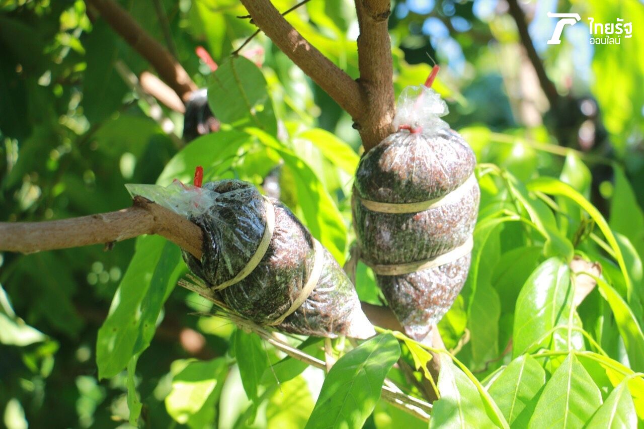 ในสวนผสมของป้าละออ ปัจจุบัน ยังคงผลไม้หลักคือ “ลำไย” ที่ตอนนี้ใกล้จะเก็บเกี่ยวผลผลิตขายได้แล้ว เธอจะคอยดูแลรดน้ำ ติดตั้งสปริงเกอร์ไว้ใต้ต้นลำไย เพียงแค่เสียบปลั๊กเครื่องปั๊มน้ำก็ทำงาน ง่ายและสะดวกต่อการดูแลสวนลำไยของเธอ