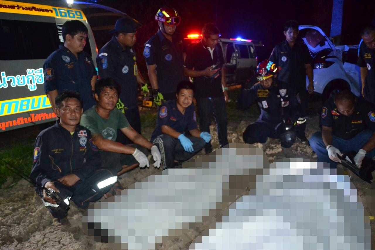 ที่เกิดเหตุพบรถเก๋ง ยี่ห้อโตโยต้า ยาริส สีขาว ทะเบียน 4 กฬ 601 กรุงเทพมหานคร ชนอัดติดเสาไฟฟ้าแรงสูงพังยับเยิน อัดชายหญิงเสียชีวิตติดคาซากรถ 2 ราย มูลนิธิฯ ต้องใช้เครื่องมือตัดถ่างประมาณ 30 นาที จึงนำร่างผู้เสียชีวิตออกมาได้ ทราบชื่อ นายยุรฉัตร หรือเอ็ม แท่งทองแท้ อายุ 23 ปี อยู่ ต.องครักษ์ อ.องครักษ์ จ.นครนายก และ น.ส.เฟิร์น ไม่ทราบชื่อและนามสกุลจริง แฟนสาว