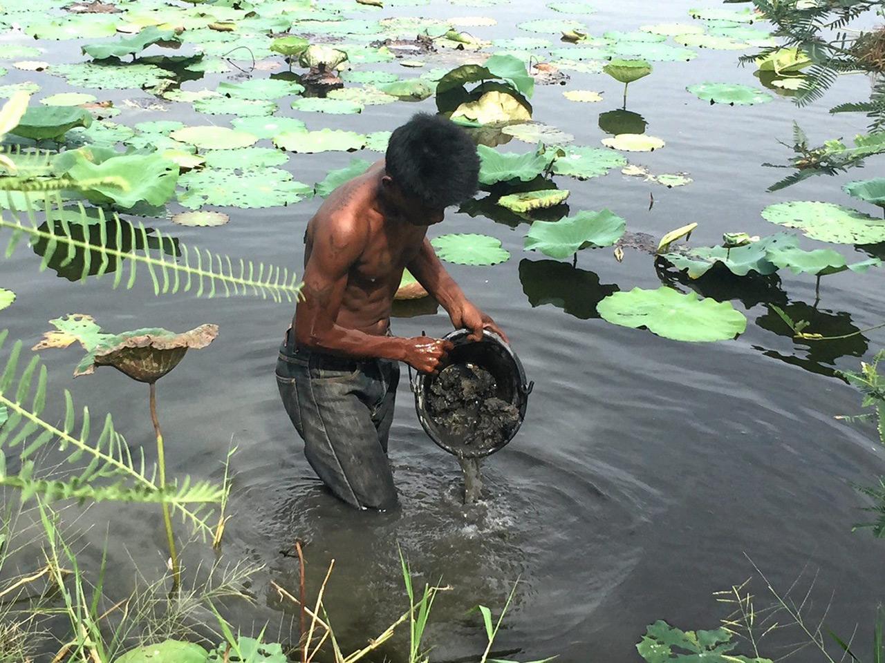 ด้วยการนำโคลนดินเหนียวละเอียดจากนาบัว นำมากรองเอาเม็ดกรวดเม็ดดินออก ใช้โคลนจากบึงบัว 3 กก. และเกลือแกง 5 ช้อนโต๊ะ นำไปผสมน้ำ 150 ลิตร นำผ้าที่เตรียมไว้แช่น้ำโคลน 3 วัน ซักน้ำสะอาด แช่น้ำขี้เถ้าถ่าน 30 นาที ล้างทำความสะอาด นำไปผึ่งลมหรือแดดอ่อนๆให้แห้ง ผ้าจะนิ่ม จะได้ผ้าหมักโคลนที่เนื้อผ้านุ่ม สวมใส่สบาย สีติดทนนาน