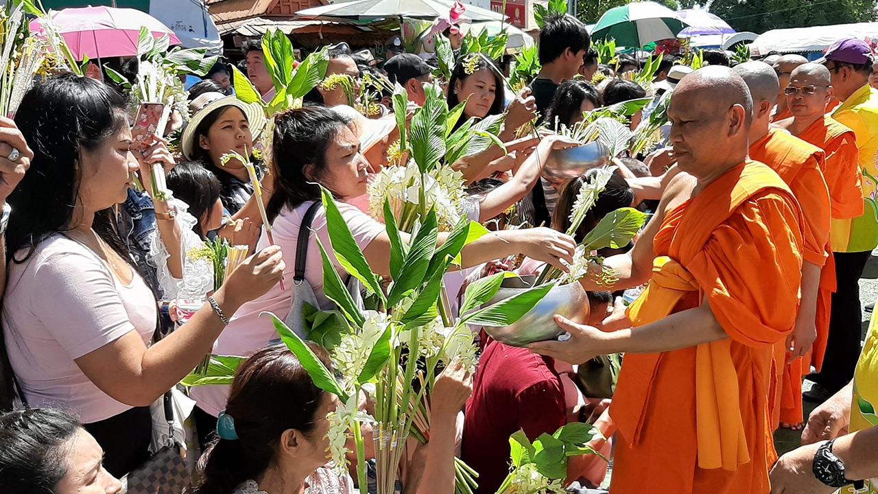 พุทธศาสนิกชนนำดอกไม้มาร่วมงานบุญตามประเพณีตักบาตรดอกเข้าพรรษาที่วัดพระพุทธบาทราชวรมหาวิหาร จ.สระบุรี พระจะนำดอกไม้ไปสักการะรอยพระพุทธบาท ชาวบ้านนำน้ำสะอาดมาล้างเท้าพระเพื่อเสริมบุญบารมี.
