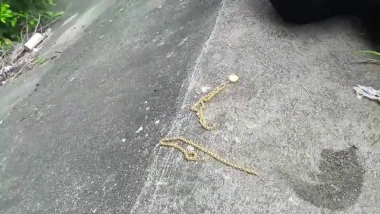 ระหว่างที่เดินข้ามสะพานลอยสังเกตเห็นชายคนดังกล่าวเดินตามหลังตนมาตั้งแต่ลงจากรถโดยสาร ตนจึงระวังตัวขณะที่ตนเดินผ่านมาทางใต้สะพานต่างระดับทางเข้าสนามบินสุวรรณภูมิ ก่อนที่ชายคนดังกล่าวจะเดินเข้ามาประกบข้างและพูดว่าขอเงิน 50 บาท ตนก็บอกไปว่าไม่มี ชายคนดังกล่าวจึงเอื้อมมือคว้าสร้อยคอทองคำที่ตนสวมใส่อยู่ที่คอ ตนจึงพยายามขัดขืนโดยใช้มือสองข้างจับยื้อเอาไว้ กระทั่งสร้อยขาด แล้วชายคนนี้ก็ผลักให้ตนตกลงไปในร่องน้ำข้างทาง แต่ตนคว้าจับมือชายคนดังกล่าวเอาไว้และดึงตกลงไปในร่องน้ำด้วยกัน