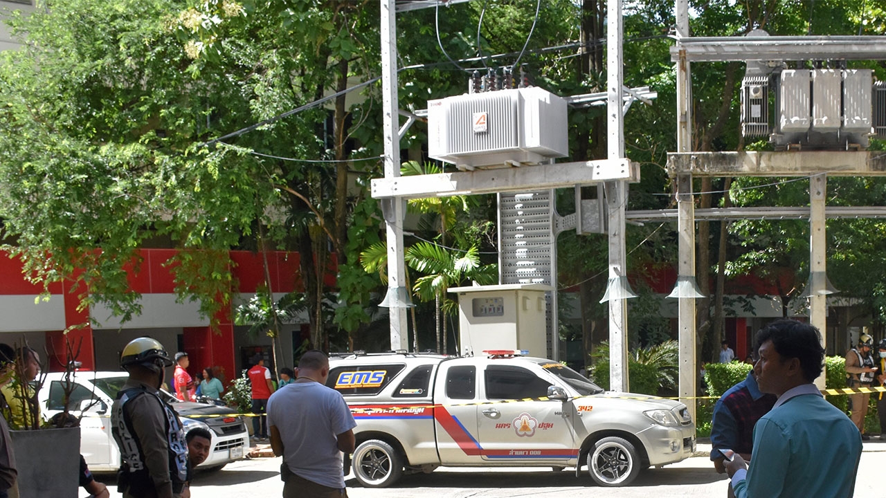 เจ้าหน้าที่ตรวจจุดเกิดเหตุที่นายเทพดำรงศ์ รักษาพล อายุ 23 ปี นศ.ปี 4 สาขาการจัดการโลจิสติกส์ มหาวิทยาลัยราชภัฏนครปฐม กระโดดจากดาดฟ้าชั้น 15 อาคารเฉลิมพระเกียรติภายในมหาวิทยาลัยเสียชีวิตสุดสลดใจ.