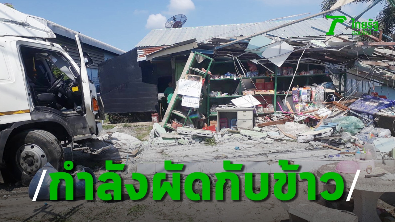 รถสิบล้อ ดัดแปลงเป็นกรงเหล็กบรรทุกหมู พุ่งชนร้านอาหารตามสั่งพังกระจาย คนขับเสียชีวิตหลังพวงมาลัย หนุ่มคนงานโดดหนีไม่ทัน อาการสาหัส