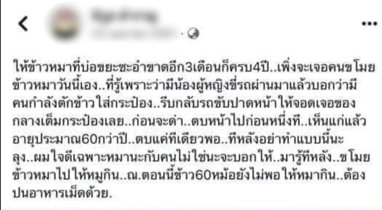 วันนั้นพอนึกได้ว่าลืมข้าวสารที่จะมาหุงเลี้ยงหมาแมว ก็เดินจะไปบ้านลูกสาว แต่ผ่านมาทางบ่อขยะเจอข้าวหมาที่มีคนคลุกข้าวมาเลี้ยงหมาแถวๆ นั้นไว้ ซึ่งก็เห็นว่า หมามันไม่กินต่อแล้ว และหากจะไปบ้านลูกสาวก็ไกล ก็เลยกอบข้าวหมาที่เหลือจะนำไปเลี้ยงหมาที่บ้านตนเอง ก็เจอผู้ชายโผล่พรวดเข้ามา แล้วต่อว่า “แก่จะตายอยู่แล้วยังมาขโมยข้าวหมาอีก” ตนก็ไม่โต้ตอบอะไร เพราะคิดว่า คนที่นำมาเลี้ยงก็นำมาเลี้ยงหมา และหมาก็กินเหลือแล้ว เราเองก็จะนำไปเลี้ยงหมาต่อ เขาคงไม่ต่อว่าอะไร แต่พอเจอเข้าจริง ก็เป็นตามที่คลิปที่เขาเอาลุงไปประจานนั่นแหละ