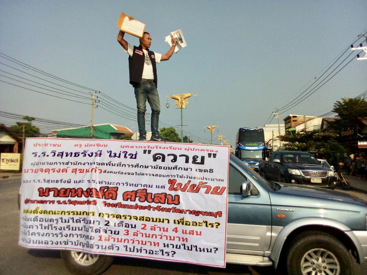 เมื่อเวลา 08.00 น. วันที่ 30 ก.ย.62 นายรพี ชำนาญเรือ ผู้ร้องเรียนให้ส่วนราชการตรวจสอบการทำงานของนายหงษ์ดี ศรีเสน ผอ.ร.ร.วิสุทธรังษี ต.ท่าล้อ อ.ท่าม่วง จ.กาญจนบุรี โรงเรียนมัธยมประจำจังหวัดกาญจนบุรี ได้นำกลุ่มผู้ไม่พอใจการบริหารงานของ นายหงษ์ดี ได้รวมตัวกันประมาณ 40 คน ที่ประตูทางเข้า โรงเรียนวิสุทธรังษี และได้ขึ้นปราศรัยบนหลังคารถยนต์จอดปิดกั้นถนนแสงชูโตขาออกจากตัวเมืองกาญจนบุรี เรียกร้องให้ สพม.8 สั่งการให้ย้าย นายหงษ์ดี ออกนอกพื้นที่ เพื่อให้เกิดกระบวนการสืบสวนข้อร้องเรียนเกิดความเป็นธรรมได้