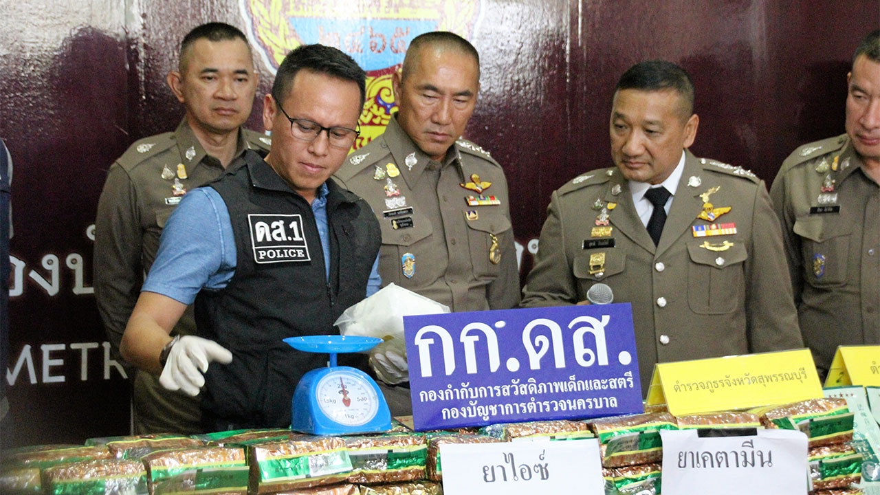 พล.ต.อ.สุชาติ ธีระสวัสดิ์ รอง ผบ.ตร. แถลงชุดสืบสวน กก.สด.บช.น. จับกุมแก๊งขนยาไอซ์ 132 กก. ยาเค 5 กก. มูลค่ากว่า 100 ล้านบาท พร้อมผู้ต้องหา 1 คน บริเวณสะพานข้ามแม่น้ำท่าจีน.