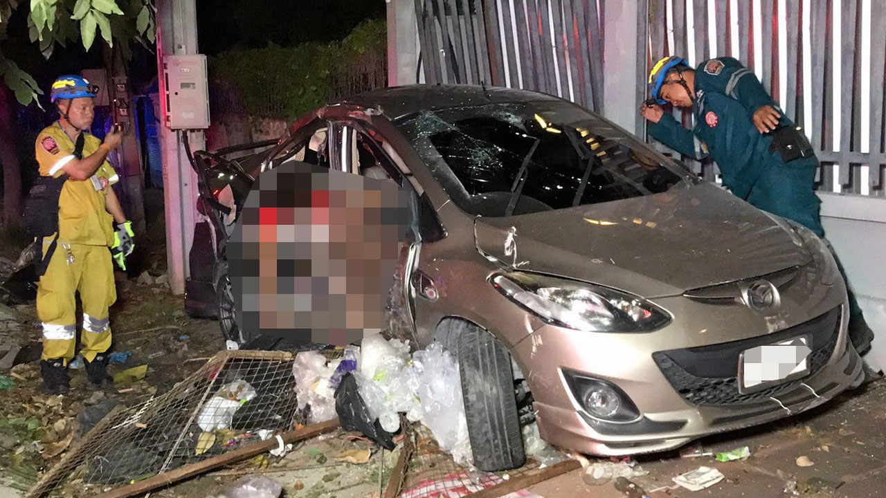 เจ้าหน้าที่ตรวจสภาพรถเก๋งมาสด้า 2 พังยับ หลัง ส.ท.จตุรนต์ ปีดเเก้ว ขับรถรับเพื่อนไปสังสรรค์ ขณะกลับบ้านเสียหลักพุ่งชนต้นไม้ข้างทางในซอยวัดลาดปลาดุก อ.บางบัวทอง จ.นนทบุรี มีผู้เสียชีวิต 2 ศพ บาดเจ็บ 2 คน.
