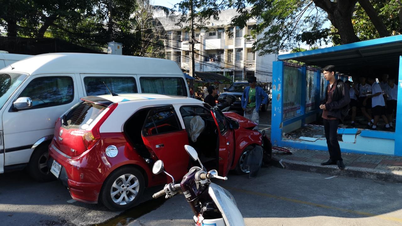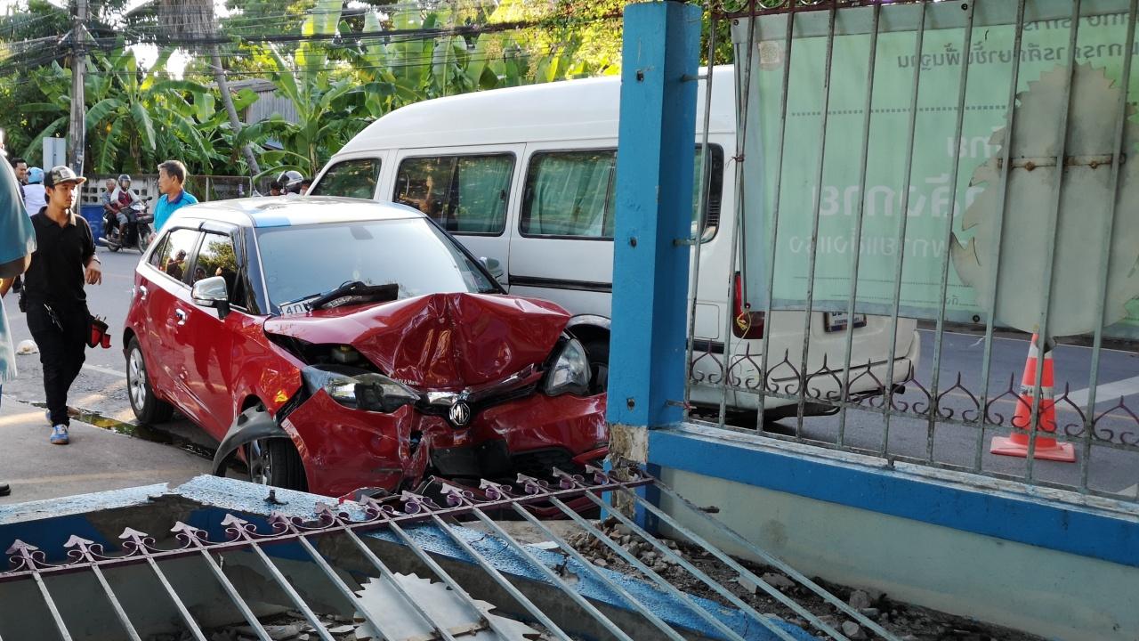 พยาบาลสาวขับเก๋ง เหยียบเบรกผิดโดนคันเร่ง รถพุ่งชนอุตลุต 3 คันรวด เป็น จยย. 2 คัน พุ่งเสยรั้วโรงเรียนประจวบวิทยาลัยพัง ขณะโรงเรียนเลิกนักเรียนกำลังกลับบ้านพอดี ทำให้มีผู้บาดเจ็บรวม 3 ราย