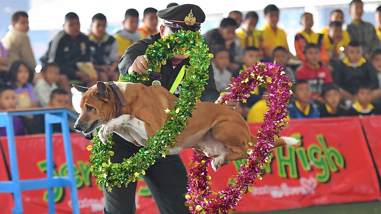 สุนัขทรงเลี้ยงเหลนคุณทองแดงร่วมแสดงความสามารถพิเศษโดยการกระโดดลอดห่วงในงานมหกรรมสัตว์เลี้ยงแห่งประเทศไทย ครั้งที่ 15 ที่ตลาดกลาง ปลาสวยงามและสัตว์เลี้ยง (ฟิชวิลเลจ) อ.บ้านโป่ง จ.ราชบุรี โดยมีประชาชนและนักท่องเที่ยวให้ความสนใจจำนวนมาก.