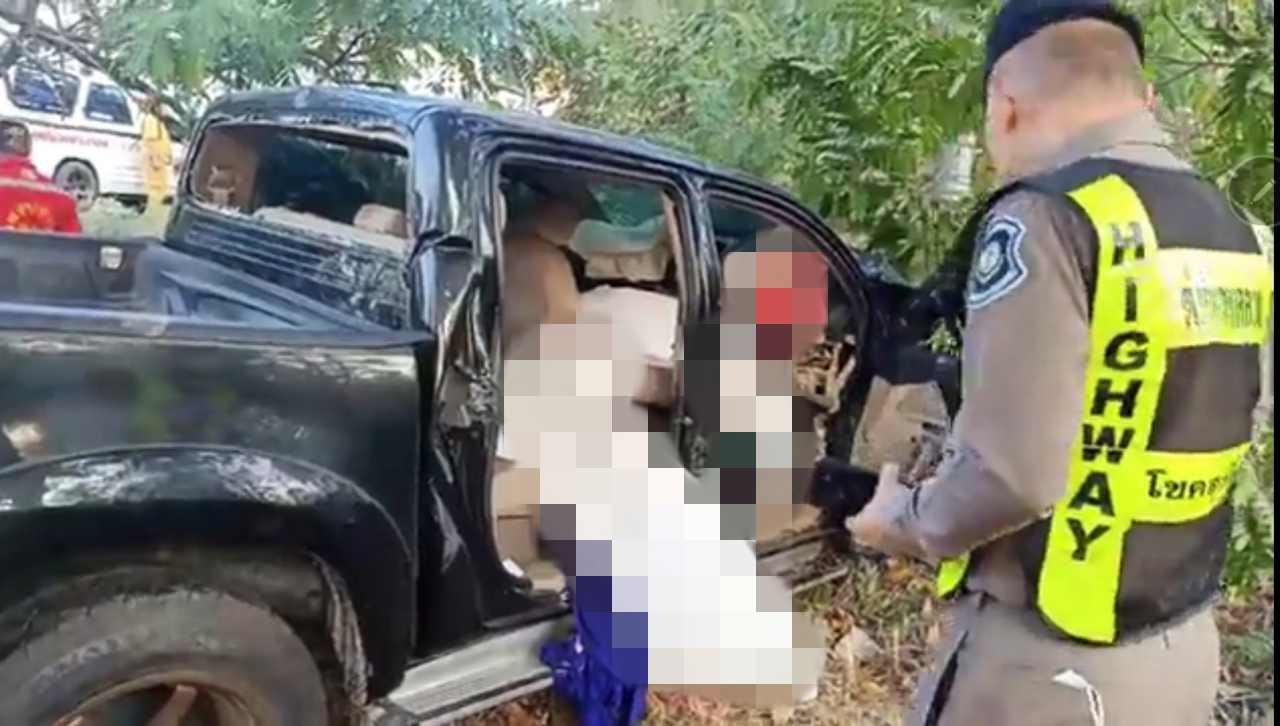 จากการสอบถามของเจ้าหน้าที่ตำรวจ เบื้องต้นทราบว่า รถกระบะคันดังกล่าว ขับรถกลับจากไปเที่ยวงานวัวลานที่ อ.ปราณบุรี จ.ประจวบคีรีขันธ์ เมื่อมาถึงจุดเกิดเหตุ คาดว่า คนขับน่าจะหลับใน ก่อนที่รถเสียหลักตกร่องกลางชนเสาปูนตอม่อเข้าอย่างจัง จนมีผู้เสียชีวิตคาที่ 2 ราย เจ็บสาหัส 5 ราย ดังกล่าว
