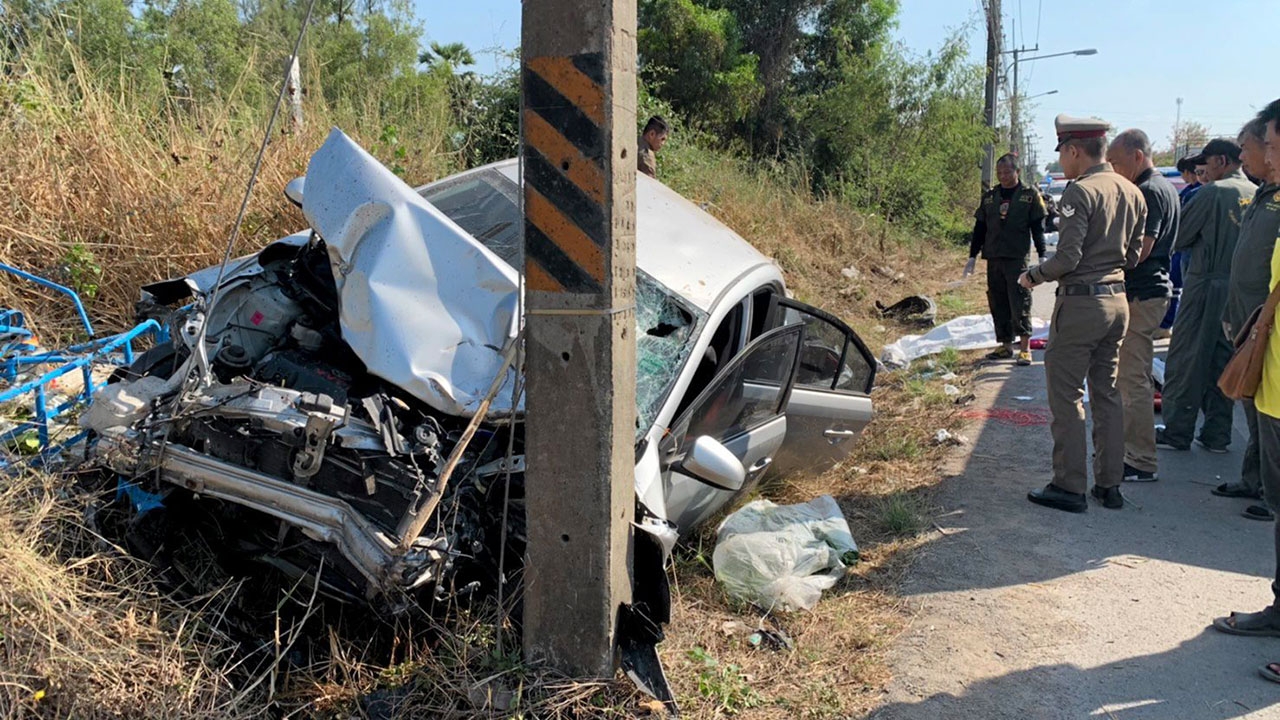จุดเกิดเหตุอยู่ริมถนน มุ่งหน้าไปทางหน้าสนามกอล์ฟอัลไพน์ พบรถเก๋งโตโยต้า วีออส สีบรอนซ์ ทะเบียน 2 กส 7836 กรุงเทพมหานคร ชนอัดเสาไฟฟ้าข้างทางพังยับทั้งคัน ด้านท้ายรถพบรถ จยย.พ่วงข้าง ยี่ห้อฮอนด้า รุ่นเวฟ 100 สีแดง ทะเบียน กนว 286 อ่างทอง พังยับเช่นกัน ห่างไปเล็กน้อยพบศพนายสมพร เจริญศรีลา อายุ 62 ปี อยู่บ้านเลขที่ 40/3467 หมู่ 4 ต.คลองสาม อ.คลองหลวง จ.ปทุมธานี นางทองใบ เจริญศรีลา อายุ 57 ปี ภรรยา และ ด.ช.ภูริพัฒน์ คงสมใจ วัย 5 ขวบ หลานชาย สภาพทั้ง 3 ศพถูกบดขยี้ร่างแหลก