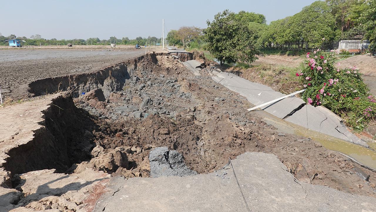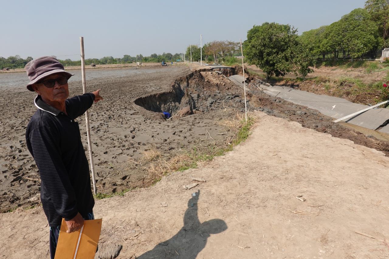 เมื่อวันที่ 7 ม.ค. 63 นายวัลลภ ทองเกตุแก้ว รองนายกองค์การบริหารส่วนตำบลคลองประเวศ พร้อมนายสำราญ แสงอินทร์ ปลัดอบต.คลองประเวศ นายปิยะพงษ์ ปิติจะ ปลัดอำเภอบ้านโพธิ์ นายพิทยา ฤากิจ หัวหน้าฝ่ายส่งน้ำและบำรุงรักษาที่ 3 (ท่าถั่ว) ลงพื้นที่ตรวจสอบจุดเกิดเหตุถนนเลียบคลองประเวศบุรีรมย์ บริเวณบ่อกุ้งของนายเสนอ ป้อมนาค อายุ 69 ปี ชาวบ้าน หมู่ 1 ต.คลองประเวศ อ.บ้านโพธิ์ จ.ฉะเชิงเทรา หลังคิดสไลด์ลงคลองพร้อมถนนและคันดินบ่อกุ้งของนายเสนอ ทำให้บ่อกุ้งที่เลี้ยงกุ้งก้ามกราม และกุ้งขาวจำนวน 10 ไร่ ไหลออกจากบ่อลงคลองทั้งหมด และระยะที่พังทลายมีความยาวประมาณ 100 เมตร ลึก 7 เมตร รถไม่สามารถสัญจรผ่านไปมาได้ และพบรอยร้าวบนถนนและคันดินบ่อกุ้งบริเวณใกล้เคียงเป็นทางยาว