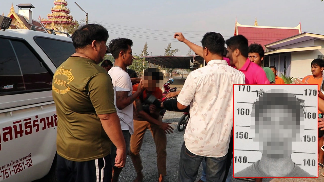 นายจักรกฤษ มีมา (รูปเล็ก) 1 ใน 2 ผู้ต้องหาทำร้ายนายณรงค์ แพรศิริ วัย 85 ปี เสียชีวิต ถูกนำตัวไปชี้จุดเกิดเหตุบริเวณเมรุเผาศพในวัดมงคลโคธาวาส อ.บางบ่อ จ.สมุทรปราการ และถูกญาติผู้ตายฝ่าวงล้อมตำรวจกระโดดถีบ.