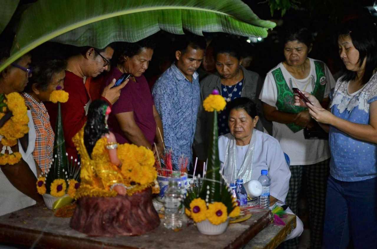 คอหวยที่ปากพลี นครนายก แห่ขอโชคลาภ"ต้นตะเคียนทอง" หลังได้ของดีไปหลายงวด อัญเชิญเจ้าแม่ออกประทับทรงช่วงค่ำ หยดน้ำตาเทียนในขัน ได้เลขเด็ดกันไปสมใจ