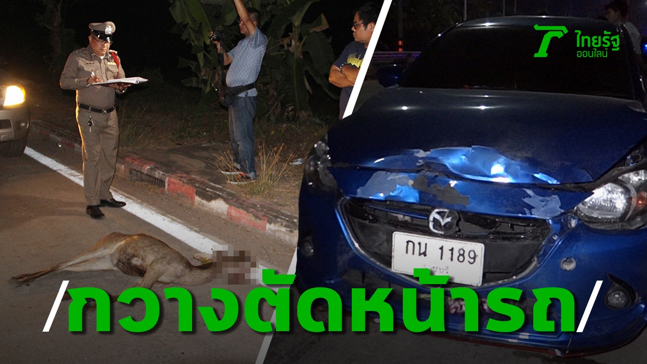 กวางพันธุ์รูซ่าวิ่งกระโดดตัดหน้า เก๋งมาสด้าเพิ่งกลับจากกินเลี้ยงงานวันเกิด เบรกไม่ทัน พุ่งชนอย่างจังดับสลด รถพังเสียหาย โชคดีไม่มีใครเป็นอะไร เหตุเกิดที่เมืองราชบุรี