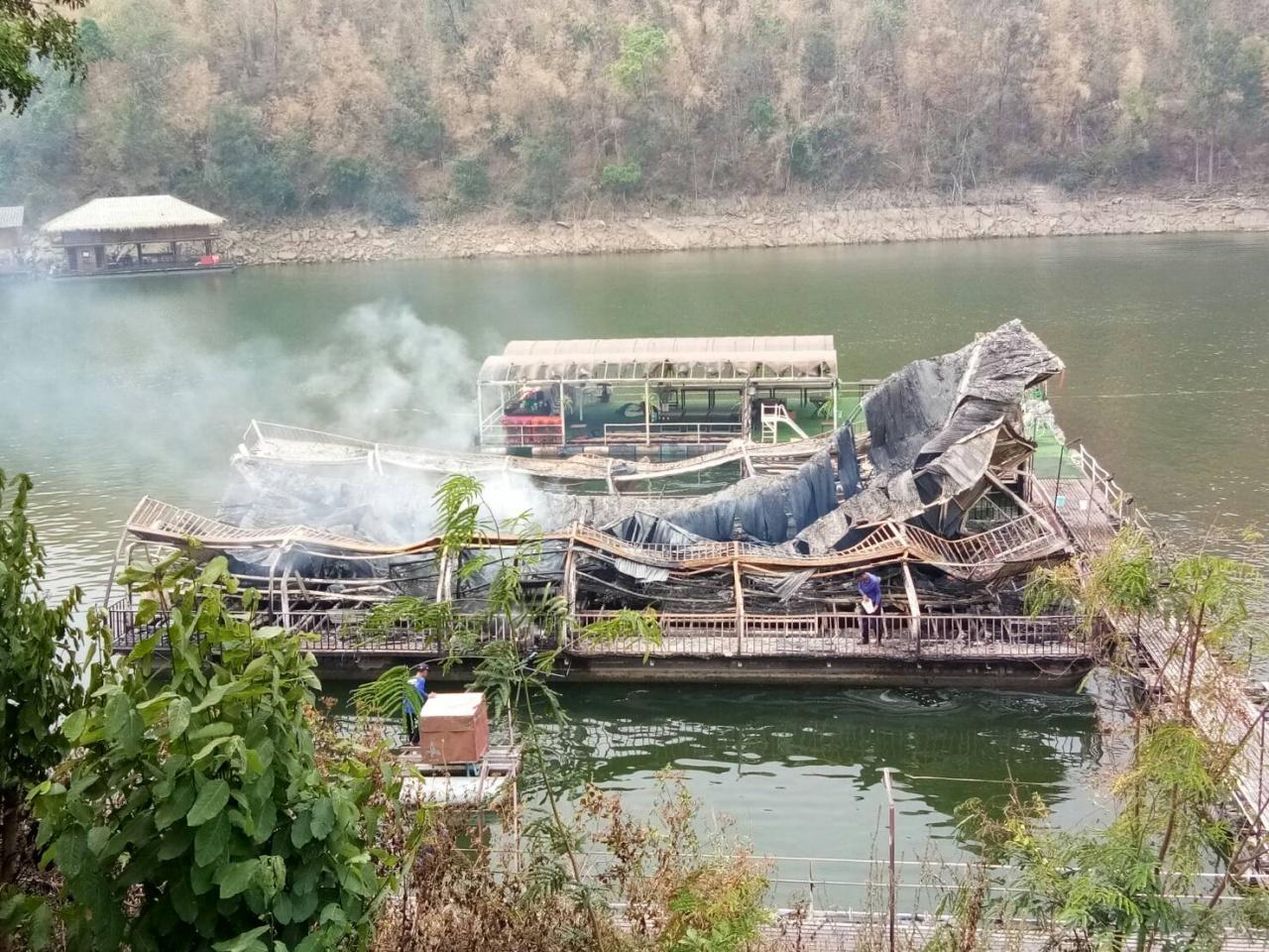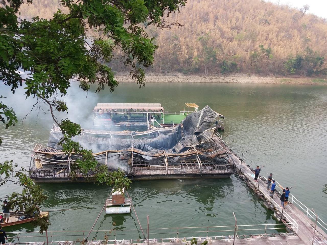 นางนงณพรรษ์ บรรจง เจ้าของ แพโฟล์ทติ้งเฮ้าส์ พร้อมคนงานกำลังช่วยกันตักน้ำระดมฉีดใส่แพพักที่ไฟกำลังลุกไหม้ เป็นแพห้องพักนักท่องเที่ยวที่จอดอยู่ชายขอบอ่างเก็บน้ำเขื่อนศรีครินทร์ โดยไฟลุกไหม้ลุกลามไหม้แพวอดไป 3 หลัง หลักแรกเป็น แพไม้ 2 ชั้น ขนาด 10 เมตร คูณ 20 เมตร 2 ชั้น แพที่ 2 เป็น แพไม้เดียว ขนาด 6 เมตรคูณ 12 เมตร และแพที่สาม เป็นแพไม้ชั้นเดียวขนาด 7 เมตร คูณ 14.5 เมตร ทั้งสามแพตบแต่งเป็นห้องพักค้างแรม รวมจำนวน 20 ห้องพัก ถูกไฟเผาวอดทั้ง 20 ห้อง ห้องพักตบแต่งหรูอย่างดี ราคาเสียหายรวมประมาณ 5.5 ล้านบาท