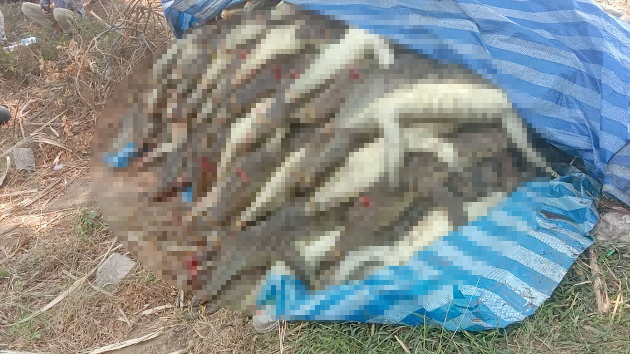 ซากจระเข้จำนวนหนึ่งถูกนำมาเก็บรวมกัน หลังหล่นกระจัดกระจายบนถนนสายพนมทวน-พระแท่น หมู่ 5 ต.อุโลกสี่หมื่น อ.ท่ามะกา จ.กาญจนบุรี ขณะบรรทุกมากับรถกระบะโตโยต้าแล้วล้อหลุดเสียหลักพลิกคว่ำลงข้างทาง.