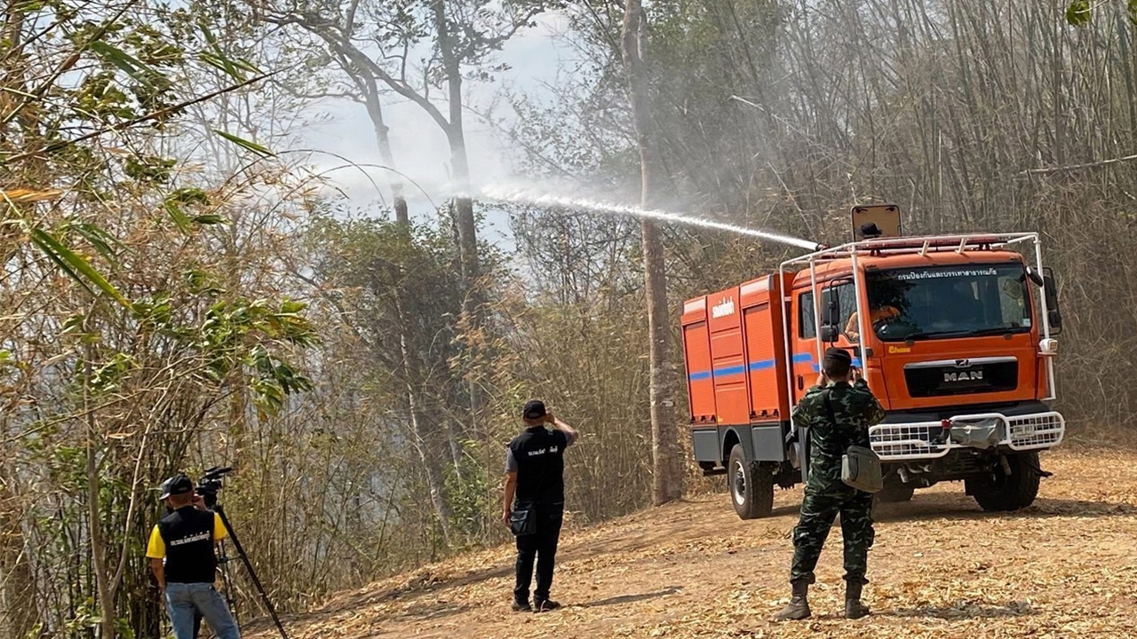 เจ้าหน้าที่นำรถดับเพลิงฉีดน้ำแรงดันสูงที่ด้านบนผาเก็บตะวัน บ้านวังใหม่ ต.บุพราหมณ์ อ.นาดี จ.ปราจีนบุรี ในเขตอุทยานแห่งชาติทับลาน เพื่อคุมพื้นที่ไฟป่าอยู่ด้านล่าง และทำให้ป่าเกิดความชุ่มชื้น ไม่ให้ลุกลามขึ้นมาบนภูเขา ส่วนบางจุดพื้นที่เป็นหุบเขา