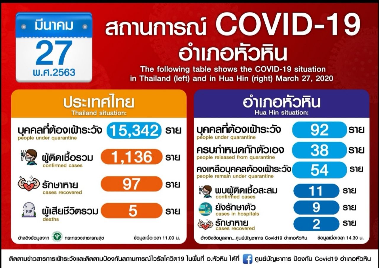 เมื่อวันที่ 27 มีนาคม 2563 ผู้สื่อข่าวรายงานว่าที่เพจเฟซบุ๊ก ศูนย์บัญชาการป้องกัน Covid-19 อำเภอหัวหิน รายงานสถานการณ์การติดเชื้อโควิด-19 ของอำเภอหัวหิน ขอสรุปข้อมูลบุคคลกลุ่มเสี่ยงที่ต้องเฝ้าระวัง ตั้งแต่วันที่ 8 มีนาคม 2563 ถึง 27 มีนาคม 2563 ดังนี้