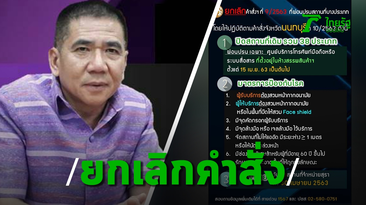 ผู้ว่าฯ นนทบุรี สั่งยกเลิกคำสั่งผ่อนปรนการเปิดสถานที่จำเป็นต่อการดำรงชีวิต 38 ประเภทแล้ว หลังเพิ่งลงนามคำสั่งเมื่อวานนี้ โดยอนุญาตผ่อนปรนให้เฉพาะศูนย์บริการโทรศัพท์มือถือที่อยู่ในห้างสรรพสินค้า ตั้งแต่วันที่ 15 เม.ย.นี้เท่านั้น แต่จะต้องทำตามมาตรการป้องกันโรค