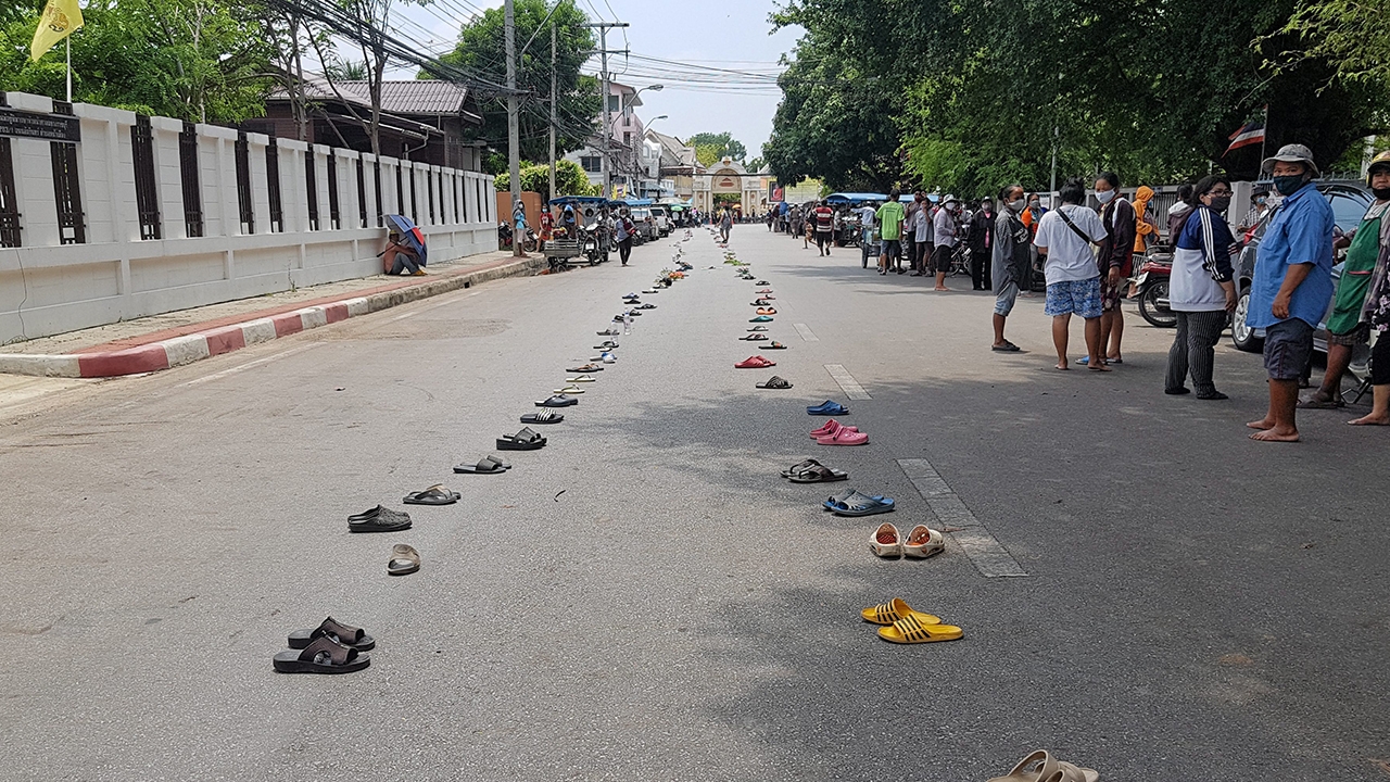 ประชาชนนับร้อยรอรับถุงยังชีพที่วัดศรีสุริยวงศารามวรวิหาร อ.เมืองราชบุรี ถอดรองเท้าจองคิวตั้งแต่เช้าแล้วไปหลบแดดข้างทาง รอเวลารับแจกตอนบ่าย ส่วนใหญ่ไม่มีรายได้ ต้องอาศัยถุงยังชีพ ข้าวแจกประทังชีวิต.