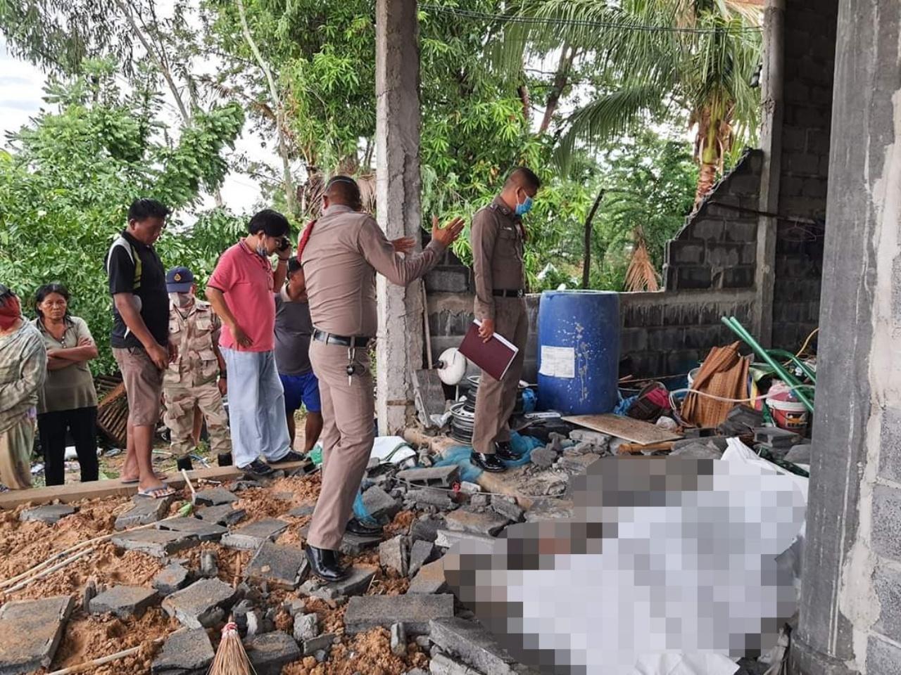 เบื้องต้นพบว่าภายในบริเวณบ้านที่เกิดเหตุ กำลังมีการก่อสร้างบ้านหลังใหม่ เป็นบ้านเดี่ยว 1 ชั้น พบผู้บาดเจ็บ คือ น.ส.สังเวียน แดงแย้ม อายุ 47 ปี นอนหมดสติอยู่ในกองกำแพงบ้านที่พังถล่มลงมา โดยมีนายสมพงษ์ อ่อนไม้ อายุ 45 ปี นอนเสียชีวิตอยู่ภายในซากกำแพงพังด้วยเช่นกัน ทางเจ้าหน้าที่กู้ชีพจึงรีบช่วยกันปฐมพยาบาลเบื้องต้นให้ผู้บาดเจ็บก่อนจะรีบนำตัวส่งโรงพยาบาลในเวลาต่อมา จากนั้น แพทย์เวรโรงพยาบาลลาดยาว จึงได้เจ้าชันสูตรศพนายสมพงษ์ เบื้องต้นพบว่าเสียชีวิตจากการถูกแรงกระแทกจากของหนัก ซึ่งทราบว่า นายสมพงษ์ ผู้ตาย และ น.ส.สังเวียน ผู้บาดเจ็บ เป็นเจ้าของบ้าน และเป็นสามีภรรยากัน