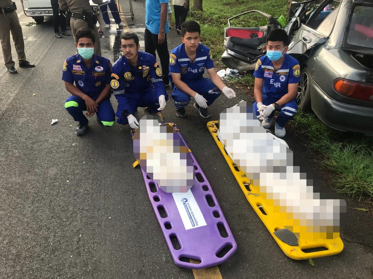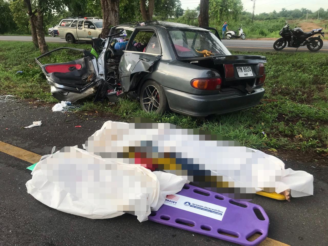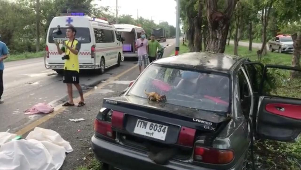 สภาพรถด้านหน้าชนอัดก๊อบปี้เข้ากับต้นสะเดาข้างร่องน้ำกลางถนนจนพังยับเยิน เบื้องต้นจากการตรวจสอบที่เกิดเหตุบนถนนไม่พบรอยล้อเบรก หรือว่ามีรถคู่กรณีแต่อย่างใด ทราบชื่อผู้ได้รับบาดเจ็บที่เจ้าหน้าที่หน่วยกู้ชีพของมูลนิธิฯ หลังเกิดเหตุได้รีบนำตัวส่ง รพ.สมเด็จพระสังฆราชองค์ที่ 19 ซึ่งเป็นคนขับรถ คือ นายบุญนำ ยอดศิริ อายุ 23 ปี อยู่บ้านเลขที่ หมู่ 9 ต.วังกระแจะ อ.ไทรโยค จ.กาญจนบุรี ในรถยังพบผู้เสียชีวิต 2 ราย เป็นหญิงสาวและเด็กผู้หญิง เป็นภรรยาและลูกสาวของนายบุญนำ ทราบชื่อ นางสาวสุธาทิพย์ ประจบ อายุ 25 ปี ชาวบ้าน หมู่ 3 ต.ดอนชะเอม อ.ท่ามะกา จ.กาญจนบุรี ส่วนลูกสาวชื่อ ด.ญ.สุธาดา ยอดศิริ อายุ 3 ปี