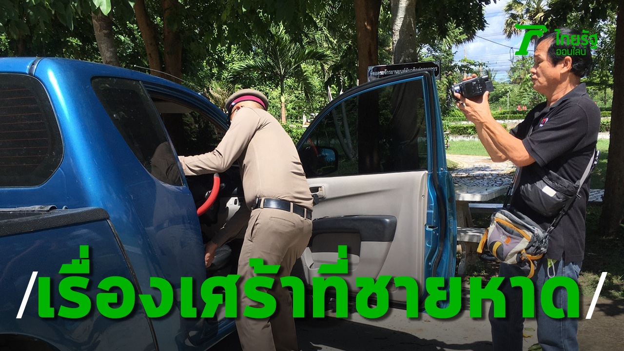พบกระบะมิตซูบิชิสตราด้าตอนครึ่ง สีฟ้า ทะเบียน กรุงเทพมหานคร หันหน้าลงทะเล ที่บริเวณประตูฝั่งคนขับเปิดออก พบร่างผู้เสียชีวิตเป็นชายลักษณะอ้วน สวมเสื้อยืดแขนสั้น กางเกงขาสั้นสีดำ นอนคว่ำหน้าเสียชีวิตอยู่บนพื้นทราย และพบหญิงสาวสวมเสื้อเชิ้ตแขนยาว กางเกงขาสั้นสีดำ นั่งอยู่ฝั่งผู้โดยสาร มีอาการคล้ายคนเมายา พูดจาไม่รู้เรื่อง