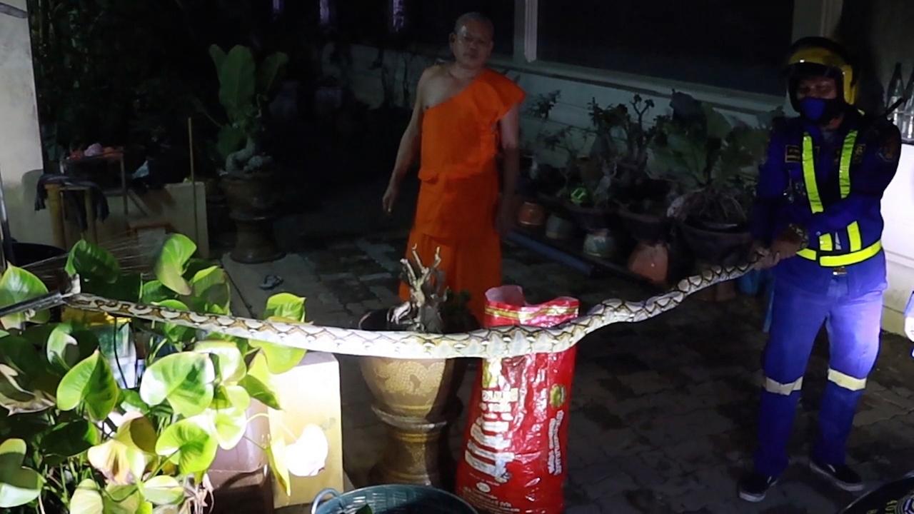พระลูกวัดใน จ.ราชบุรี ตกใจเจองูเหลือมตกลงมาจากกุฏิ จึงแจ้งเจ้าหน้าที่มูลนิธิมาช่วยจับ โดยเชื่อว่างูตัวนี้คือสาเหตุที่ทำให้แมวกับไก่ในวัดหายไปหลายสิบตัวในช่วงที่ผ่านมา