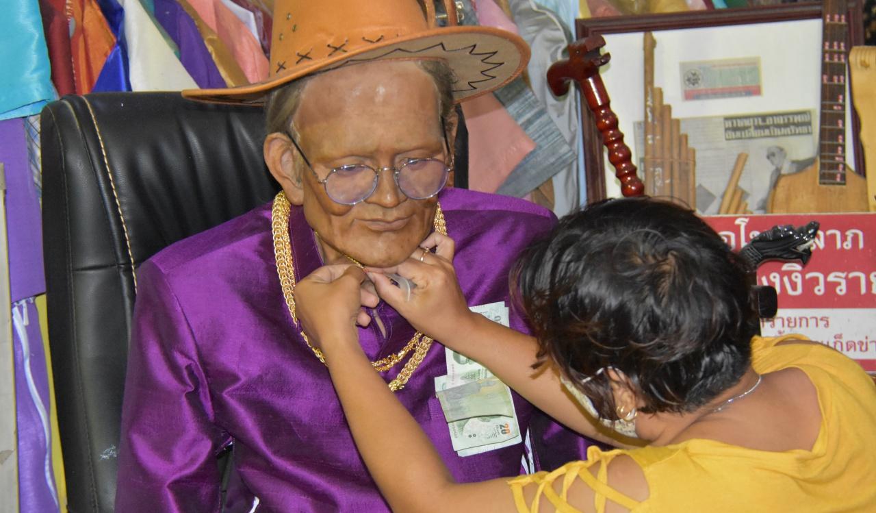 น.ส.ธัญวลักษณ์ เปิดเผยว่า ได้เดินทางมาที่วัด เพื่อนำของแก้บนมามอบให้ตาทอง งิ้วราย เป็นสร้อยคอทองคำหนัก 1 บาท พร้อมชุดเสื้อผ้า ซึ่งก่อนหน้าที่หวยจะออกได้มาขอพรจุดธูปบอกกล่าวตาทอง งิ้วราย หากได้โชคลาภจะกลับมาอีกครั้ง โดยงวดที่ผ่านมาได้โชคจากการเขย่าเซียมซีและล้วงไข่ในตะข้องที่ตั้งอยู่ ในอ่างน้ำมนต์เอาไปตีเลขได้เลข 258 ส่วนเขย่าเซียมซีได้เลข 83 ปรากฏว่าหวยออกแล้วถูกได้เงินกว่า 70,000 บาท เลยซื้อทองหนัก 1 บาท มามอบให้ตามที่สัญญาไว้