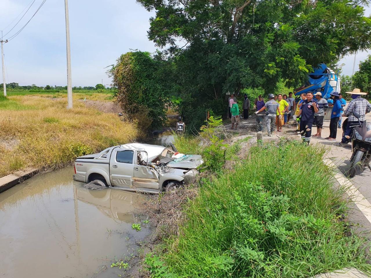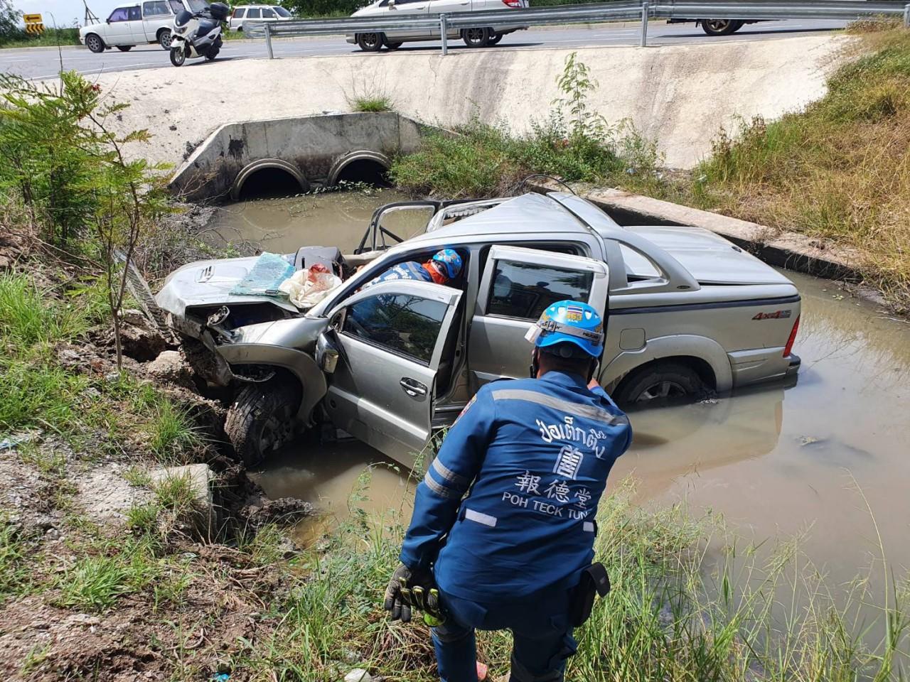 ในที่เกิดเหตุช่วงทางเข้าตัวเมืองปทุมฯ ภายในคลองระแวะ พบกระบะโตโยต้า สีเทา หมายเลขทะเบียน ฎก-6970 กรุงเทพมหานคร ตกลงไปในคลองล้อรถจมเลนทั้ง 4 ล้อ สภาพรถหลังคายุบหน้ารถพัง ภายในรถพบผู้เสียชีวิตที่เบาะคนขับ ทราบชื่อนายสุพจน์ หงษ์หิน อายุ 56 ปี ชาวบ้าน ม.3 ต.บางกระบือ อ.สามโคก จ.ปทุมธานี นอกจากนี้ยังมีผู้ได้รับบาดเจ็บเป็นเด็กอีกสองคนซึ่งเป็นฝาแฝดกัน ทราบชื่อ ด.ช.ธารา และ ด.ช.หินผา คำสมบูรณ์ อายุ 7 ขวบ ทั้งคู่อาการสาหัส อาสาฯ จึงรีบนำส่ง รพ.กรุงสยามเซนต์คาร์ลอส