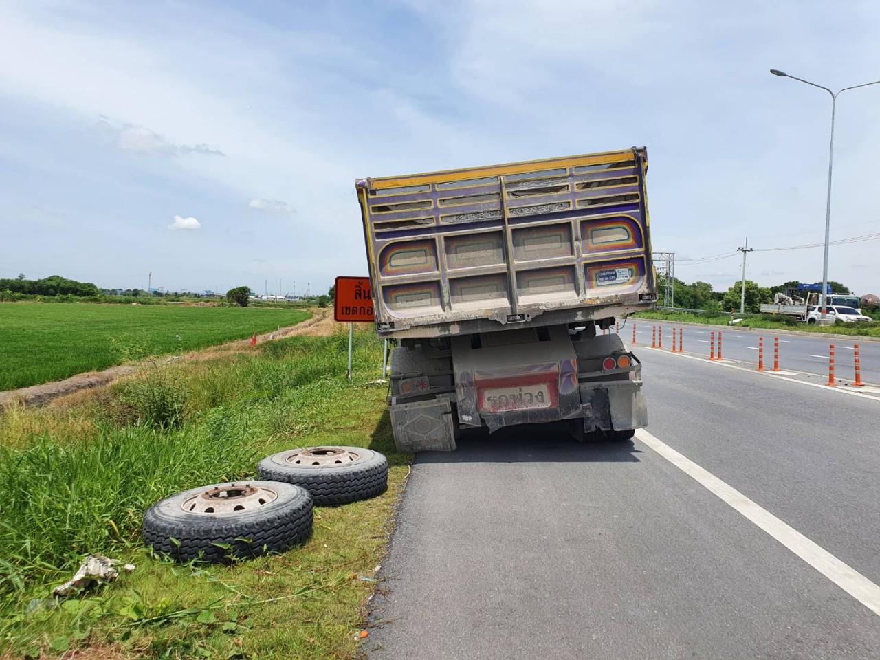 ในที่เกิดเหตุพบ นายดิลกทรัพย์ คุสิตา อายุ 26 ปี ชาวบ้าน ม.8 ต.สะเดา อ.พลับพลาชัย จ.บุรีรัมย์ ยืนให้การอยู่ในที่เกิดเหตุ กล่าวว่า ขับรถพ่วงฮีโน่ หมายเลขทะเบียน 71-5182 นครปฐม ส่วนตัวลูกหมายเลขทะเบียน 71-5168 นครปฐม บรรทุกหินเต็มคันมาจาก จ.สระบุรี เพื่อมุ่งหน้าไป จ.นนทบุรี เมื่อมาถึงตรงข้ามจุดเกิดเหตุมองกระจกข้างเห็นว่าล้อหลังซ้ายตัวลูกล้อส่ายสะบัดคล้ายจะหลุดตนจึงชะลอรถจากนั้นล้อก็หลุดทันที เมื่อตนจอดรถชิดขอบทาง จึงลงมาดูพบว่าล้อหลุดไป 1 ล้อ ก่อนเดินตามหา และมารู้ว่าล้อกระเด็นข้ามเกาะไปฝั่งตรงข้าม จึงไปเข็นล้อมาไว้ข้างรถ ต่อมาได้มีคนขับรถ จยย.มาบอกตนว่า ล้อรถตนไปกระแทกตกใส่รถกระบะและตกไปในคลอง ตนจึงรีบมาดูก็พบว่ามีคนเจ็บและเสียชีวิตดังกล่าว