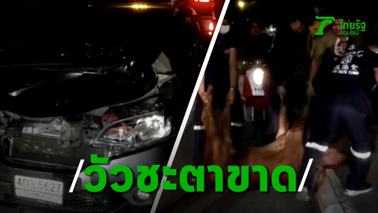 เหตุสลด วัวเพศเมียวัยขวบเศษหลุดออกจากคอก วิ่งตัดหน้าถูกเก๋งพุ่งชนนอนจมกองเลือด เสียชีวิตกลางถนนย่านบางพลี ส่วนรถคันดังกล่าวพังยับเยิน