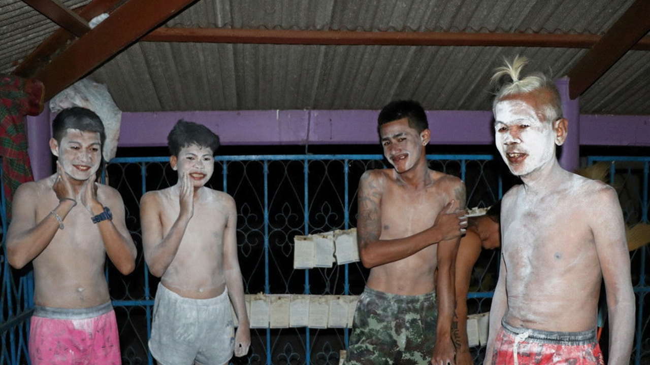 บรรดาหนุ่มๆทาแป้งตามตัวให้ขาวโพลน เตรียมแก้ผ้ารำแก้บนรอบศาลาวัดหลวงพ่อขาว อ.วิเศษชัยชาญ จ.อ่างทอง หลังบนขอให้รอดเกณฑ์ทหาร เช่นเดียวกับนายพีรพัฒน์ เสาศิริ และกองเชียร์ เตรียมรำแก้บนเช่นกัน.