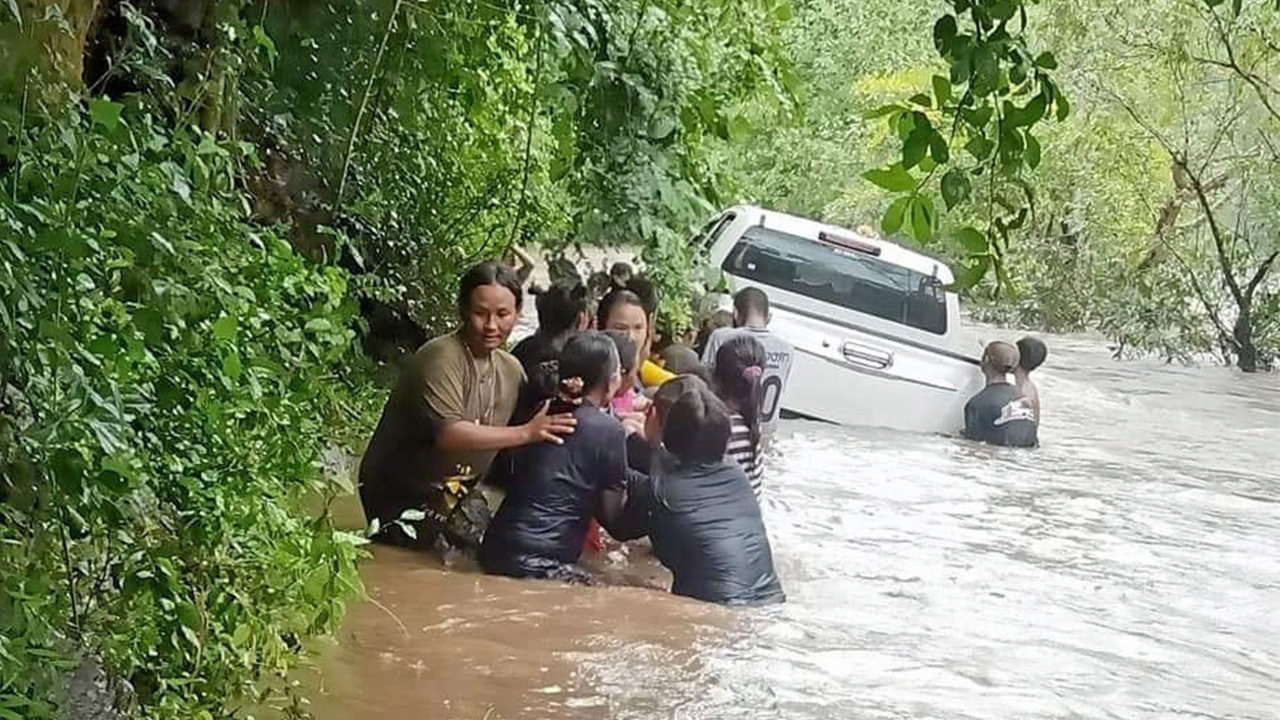 สภาพรถกระบะพยายามขับฝ่ากระแสน้ำป่าไหลหลากท่วมถนนทางขึ้นหมู่บ้านบ้านโป่งลึก-บางกลอย ต.ห้วยแม่เพรียง อ.แก่งกระจาน จ.เพชรบุรี แต่เครื่องยนต์เกิดดับและกำลังถูกพัดไปตามกระแสน้ำ โชคดีมีชาวบ้านในละแวกใกล้เคียงมาพบเห็นรีบนำเชือกมาผูกกับรถและช่วยกันดึงขึ้นจากน้ำป่าได้อย่างหวุดหวิด.