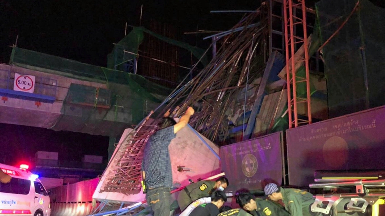 เจ้าหน้าที่ช่วยเหลือคนงานก่อสร้างรถไฟฟ้าสายสีชมพู (แคราย-มีนบุรี) สถานีศรีรัช ถนนแจ้งวัฒนะ อ.ปากเกร็ด จ.นนทบุรี ขึ้นไปเทปูนเชื่อมคานกับเสาตอม่อ เคราะห์ร้ายนั่งร้านเหล็กเกิดทรุดพังถล่มลงมาได้รับบาดเจ็บ 5 คน.