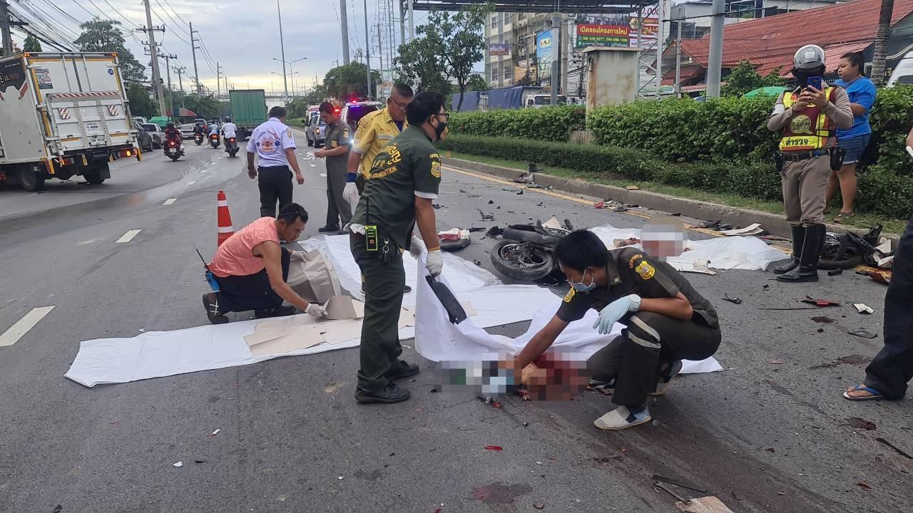 เมื่อถึงที่เกิดเหตุบริเวณ ถนนสุขสวัสดิ์ หน้าโรงเรียนราชประชาสมาสัย ฝ่ายมัธยม รัชดาภิเษกในพระบรมราชูปถัมภ์ หมู่ที่ 1 ตำบลบางจาก อำเภอพระประแดง จังหวัดสมุทรปราการ พบรถ จยย.ยามาฮ่า ฟิโน สีแดง หมายเลขทะเบียน 1 ขฒ 9260 กทม พังยับเยิน ขาด 2 ท่อน โดยที่พื้นถนนเต็มไปเศษชิ้นส่วนอวัยวะมนุษย์และคราบเลือด