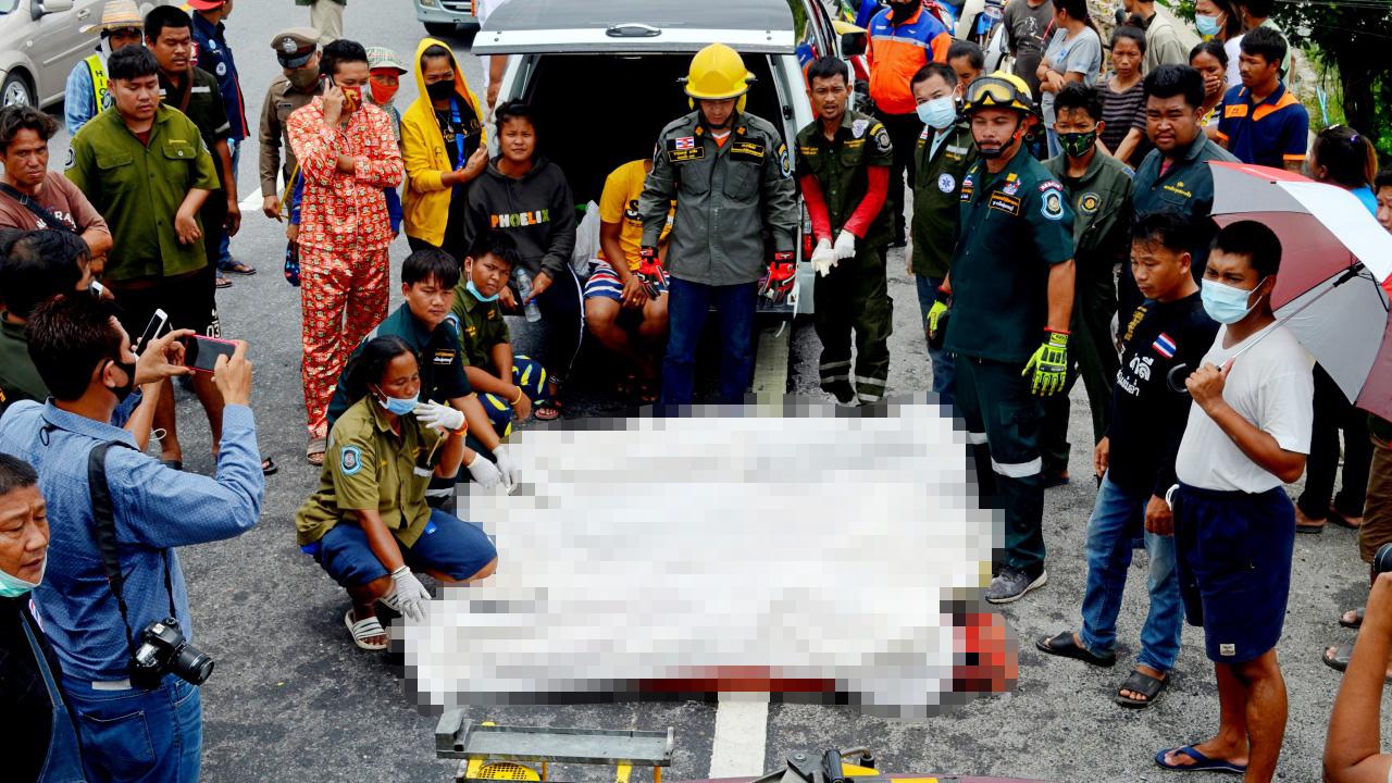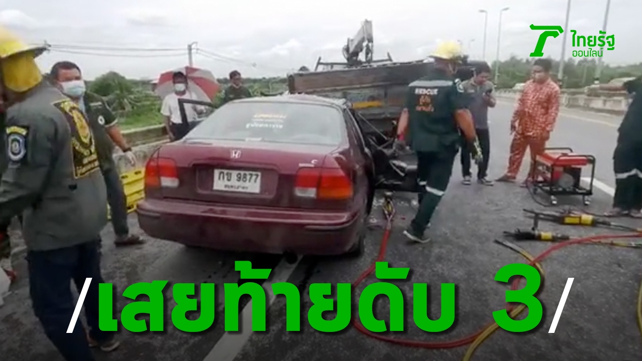 เก๋งซิ่งแซงสองแถว เจอรถพ่วงอยู่ข้างหน้า หักแซงซ้ายเจอ 6 ล้อจอดขวาง เสยท้าย ตาย 3 สาหัส 1 โชเฟอร์ 6 ล้อเผย รถส่ายจึงจอดดู ก่อนถูกเก๋งพุ่งชนสนั่น