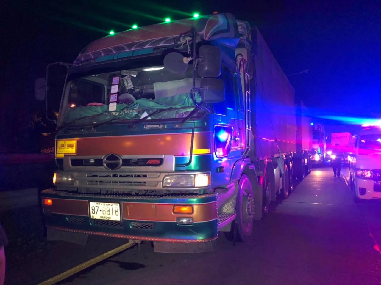 นายมงคล หอยมณี อายุ 43 ปี ผู้ขับรถบรรทุกพ่วง 18 ล้อยี่ห้ออีซูซุ ทะเบียนส่วนหัวลาก 87-8818 นครปฐม ส่วนท้ายพ่วงทะเบียน 87-8819 นครปฐม ซึ่งเป็นอีก 1 คันที่จอดอยู่ด้านหน้ากล่าวว่ารถของตนเองนั้นยางล้อหน้าด้านขวาแตกจึงได้จอดทำการเปลี่ยนยาง โดยมีรถบรรทุกพ่วงอีก 1 คันจอดปิดท้ายไว้ ต่อมามีรถกระบะแบบตู้ทึบยี่ห้อ โตโยต้า สีขาว ทะเบียน บธ 5040 ปทุมธานี เสียหลักมาเฉี่ยวชนเข้าที่ท้ายรถบรรทุกที่จอดปิดท้าย หลังเกิดเหตุได้เพียงไม่ถึง 5 นาทีรถเก๋งที่มาด้วยความเร็วพุ่งเข้ามาชนที่ด้านท้ายรถพ่วงซ้ำอีกครั้งอย่างเต็มแรงจึงเป็นสาเหตุให้มีผู้บาดเจ็บดังกล่าว