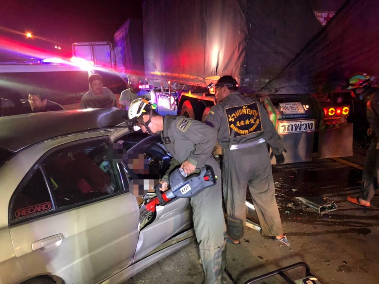 กู้ภัยนนทบุรีช่วย 3 ชีวิตเจ็บสาหัส ติดคาซากรถเก๋งหลังพุ่งอัดท้ายรถบรรทุกพ่วงจอดยางแตกอยู่เลนขวาสุด บนทางหลวงบางบัวทอง-บางปะอิน พื้นที่ อ.บางบัวทอง ตามหลังกระบะที่หลบไม่พ้นชนไปก่อนหน้ารถเก๋ง