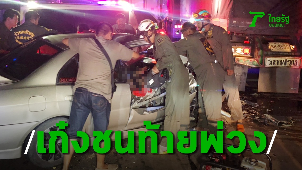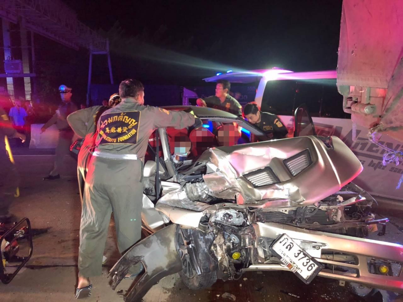 เมื่อเวลา 23.15 น.วันที่ 15 ส.ค.63 ร.ต.อ.เอกโกวิทย์ ศรีนิลทา รอง สว.สอบสวน สภ.บางบัวทอง จ.นนทบุรี รับแจ้งเหตุ รถเก๋งชนท้ายรถ บรรทุกพ่วง 18 ล้อ มีผู้ได้รับบาดเจ็บหลายราย ติดอยู่ภายในรถเหตุเกิดหน้าปั๊มน้ำมันเอสโซ่ ถนนทางหลวงหมายเลข 9 (บางบัวทอง-บางปะอิน) ขาออก ต.ลำโพ อ.บางบัวทอง จ.นนทบุรี จึงประสานอาสาสมัครมูลนิธิร่วมกตัญญู เดินทางไปที่เกิดเหตุ