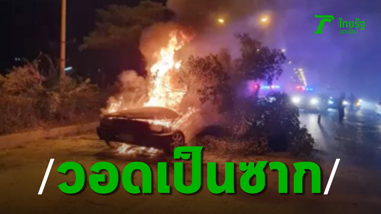 หนุ่มใหญ่อยุธยา ควบเก๋งเสียหลัก พุ่งชนเกาะกลางถนน ฟาดต้นไม้ขาด 2 ท่อน ไฟลุกท่วมคัน โหมวอดพังยับ โชคดีหวิดดับ คนขับเจ็บ 1