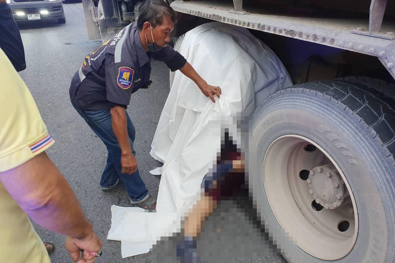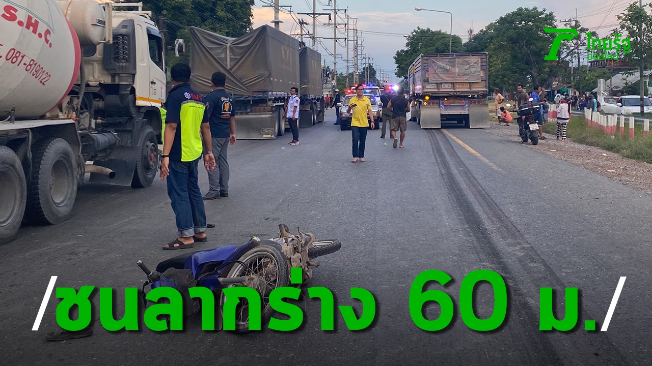 รถบรรทุกพ่วง 22 ล้อเฉี่ยว จยย.ป้าวัย 57 ปี จนล้มก่อนทับร่าง จนหมวกกันน็อกติดคาล้อลากไกลกว่า 60 เมตร ตายคาที่บนถนนสุวรรณศร อ.เมือง จ.นครนายก ตร.คาดผู้ตายขี่มาใกล้รถพ่วงในเลนขวาจนถูกเฉี่ยวล้ม